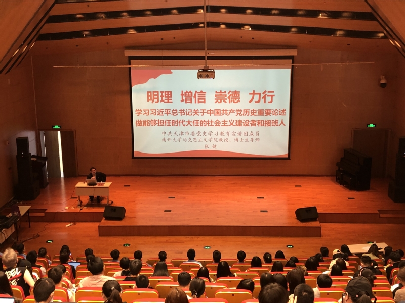 “爱国主义是中华民族的民族心、民族魂”。张健结合图文资料、播放音视频等多种方式,带领大家重温了习近平总书记给南开师生的寄语。他强调,作为党员一定要认真研读党史基本著作,全面了解中国共产党的发展历程,如是才能明白中国特色社会主义的来之不易,才能更好地坚定自身的理想信念。讲座最后,张健表明,今天对五四运动最好的纪念,就是让五四精神在新时代放射新的光芒,希望党员团员们能够将爱国情怀根植于心,努力成为一个德智体美劳全面发展的人,为祖国的繁荣昌盛做出我们这一代人的贡献。