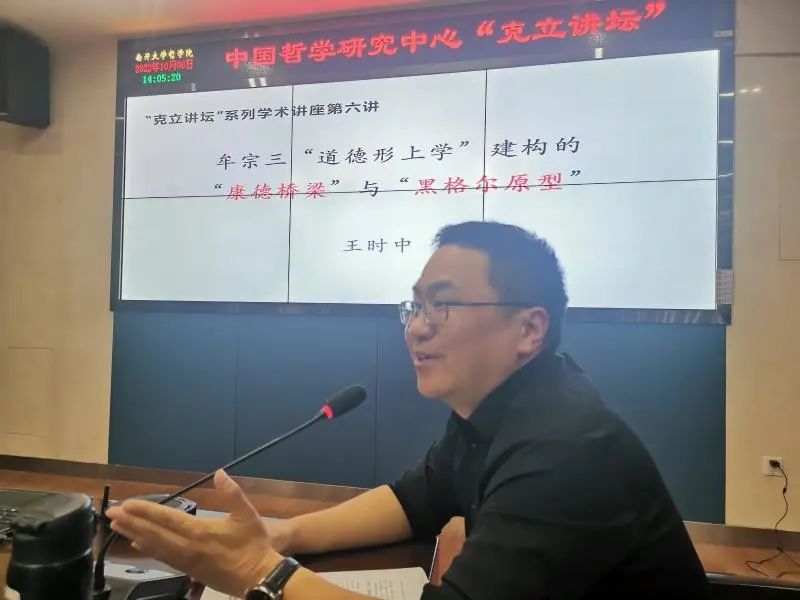 接下来,王时中教授从“牟宗三的道德形上学的康德桥梁”“牟宗三的道德形上学的黑格尔原型”“对牟宗三的道德形上学的同情的理解”“对牟宗三的道德形上学的再推进”四个部分展开了讲座的内容。王教授认为,牟宗三充分肯定康德道德形而上学的用意在于援引康德来论证中国的道德传统也具有先验性与普遍性。与此同时,牟宗三也指出了自己对康德道德底形上学的四个方面的批评:第一,由于康德不理解“道德感”与“道德情感”具有“实然”与“超越”两个层面,而仅将“道德情感”局限于“实然”层面,从而将“道德情感”与“道德感”混同于私人幸福原则,无法使道德法则、道德理性成为最为本质的一环。第二,康德道德哲学中的“意志自由”只是一个“设准”与“假定”,康德将“道德感”当作经验排除出去的做法,使得道德法则难以落实呈现。第三,康德的道德形而上学只是以道德为对象的形而上解析,而不是以道德为进路的形而上学构造,所以康德无法构造出一种具体而普遍的“道德的形上学”,而只是“道德底形上学”。第四,康德试图以“目的性原理”对接“自然的因果性”与“自由的因果性”的尝试并不能称之为圆满。