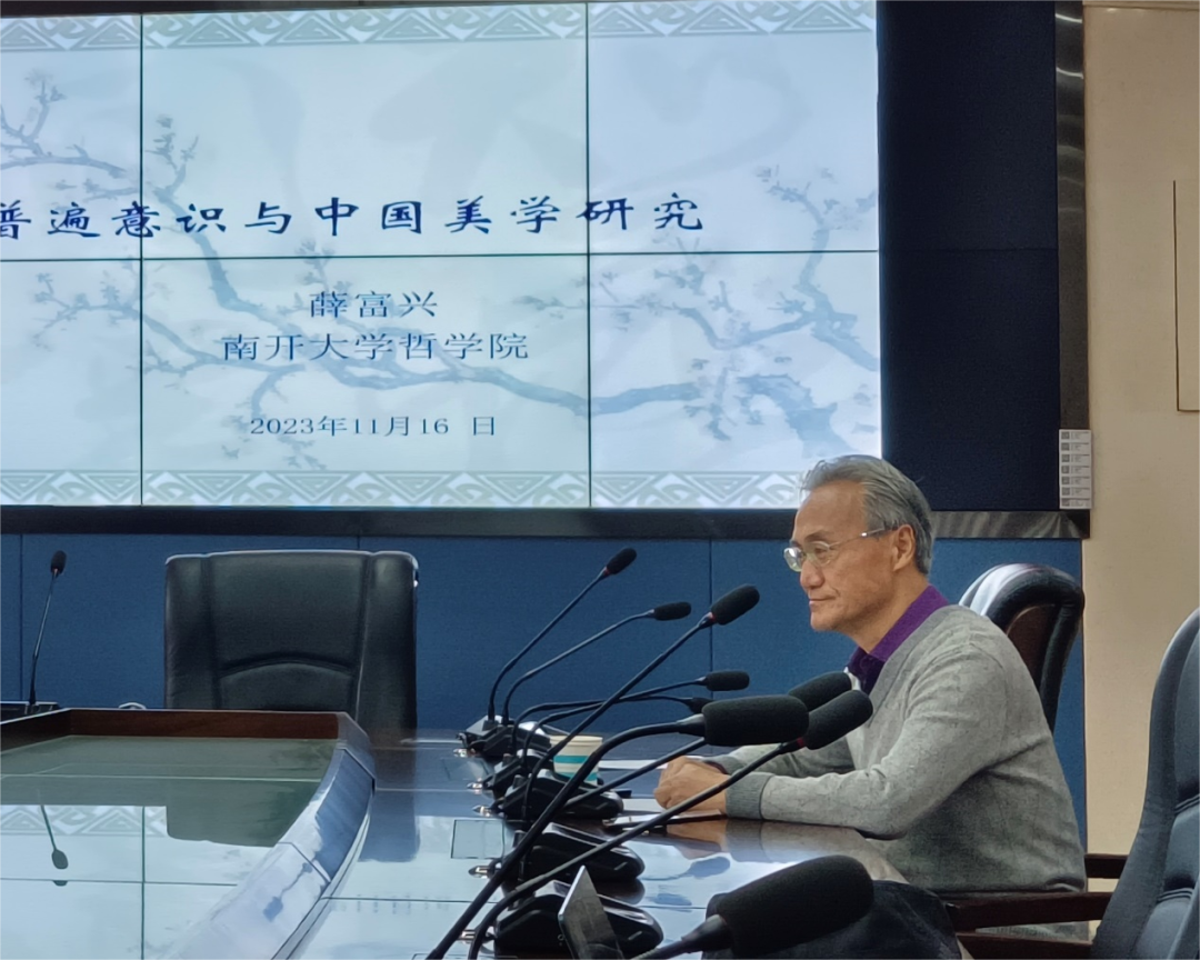 2023年11月16日下午,yl7703永利集团中国哲学研究中心举办了“克立讲坛”系列学术讲座的第十五讲,讲座主题为“普遍意识与中国美学研究”。本次讲座由美学教研室主任薛富兴老师担任主讲人,中国哲学教研室主任严正老师担任主持人。本科生、硕博研究生20余人到场聆听讲座。