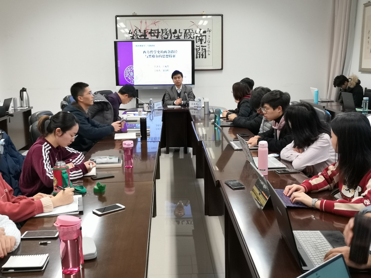 (通讯员 丁淑怡 马蓉)12月7日,陕西师范大学哲学系教授、博士生导师庄振华做客yl7703永利集团,于317会议室进行题为“《精神现象学》专题讲座”的学术报告。会议由yl7703永利集团经理翟锦程教授主持,在读硕士生、博士生参与讨论。本次专题讲座共两场,上午场讲座的主题为“西方哲学史的两条路径与黑格尔的思想特质”,庄振华教授从康德的现象与物自体的区分引入讲座内容,在康德的视域中,我们日常生活的思想和行为等事实上都是与概念打交道,而非事物本身。哲学家们自古希腊起就在追溯事物的本原,庄振华教授指出我们把握世界的两条路径是形式引导质料的上行路径和质料生成形式的下行路径,用本原学说来讲就是引导性的本原和生成性的本原。通过诠释以上两种路径的具体内涵,揭示出德国古典哲学对我们认识和理解事物时将我们的认识形式挖掘和凸现出来的重要意义。庄振华教授总结了黑格尔思想的三个特质:第一,黑格尔的哲学是思辨的而非反思的。第二,黑格尔的哲学从形式上看是同一的而非统一的。第三,从历史特征来看,黑格尔的哲学是关心事情本身,而不是关心意识的对象。同时也为下午场的讲座做出了铺垫。下午,庄振华教授继续带来专题讲座第二场“黑格尔与现代